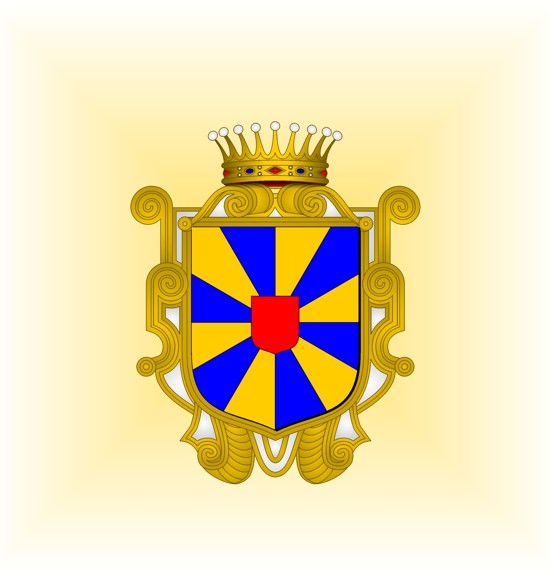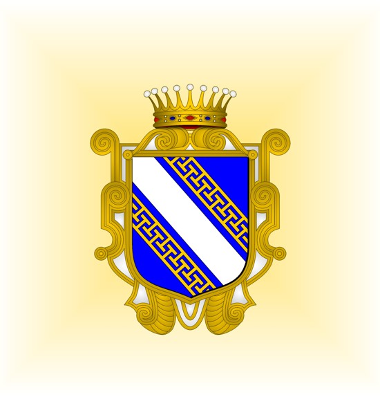 Ces armoiries sont celles des anciens Comtes Palatins de Champagne, de la Maison de Blois, titulaires de l’une des six anciennes Pairies laïques du Royaume de France. A l’origine, la bande d’argent était accompagnée de deux simples cotices d’or, puis avec le développement économique de la Champagne (grâce notamment aux fameuses "Foires de Champagne"), les arts décoratifs et textiles y connurent un grand développement, de sorte qu’il devint d’un raffinement habituel de représenter les armoiries (entre autres) non plus par de simples aplats de couleurs, mais avec des écussons et des pièces honorables où les aplats sont remplis de dessins plus ou moins savants, souvent mais pas nécessairement géométriques, selon la technique héraldique dite du "diapré".
