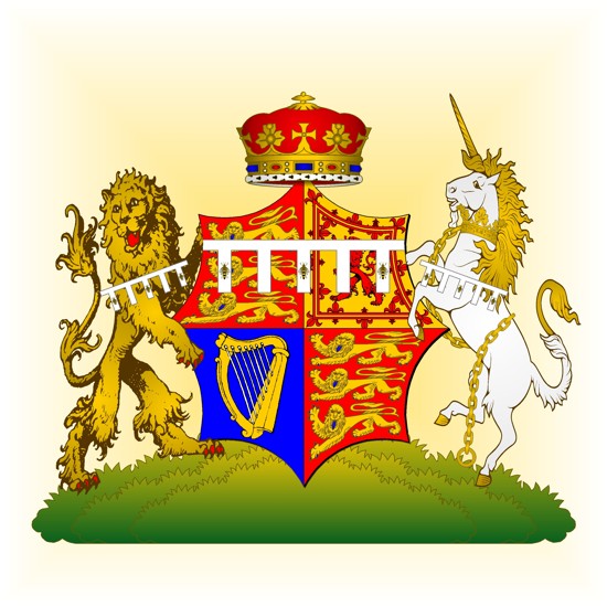 Ecartelé : 1 et 4, de gueules, à trois léopards d’or (Angleterre); 2, d’or, au lion de gueules, au double trescheur fleuronné et contre-fleuronné du même (Ecosse); 3, , d’azur, à la harpe d’or, cordée d’argent (Irlande); au lambel (5) d'argent, brochant sur-le-tout, les premier, troisième et cinquième pendants chargés d'une abeille au naturel.