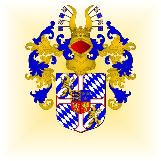 Ecartelé : à la croix pattée d'argent bordée de gueules, qui est le Danebrog, cantonnée en 1 et 4, d'azur, à trois barres ondées d'argent, au lion couronné d'or, brochant sur-le-tout.(Suède ancien) ; en 2 et 3, fuselé en bande d'argent et d'azur (Bavière) ; sur-le-tout écartelé : 1, d'or, à neuf cœurs de gueules, posés en trois pals, à trois lions léopardés d'azur, armés et lampassés de gueules, couronnés du champ, brochant sur-le-tout.(Danemark) ; 2, d'azur, à trois couronnes d'or (Union de Calmar - Suède moderne) ; 3, de gueules, au lion couronné d'or,tenant dans ses pattes une hache danoise d'argent, emmanchée du second (Norvège); 4, de gueules, au dragon volant d'or (Royaume des Wendes).
