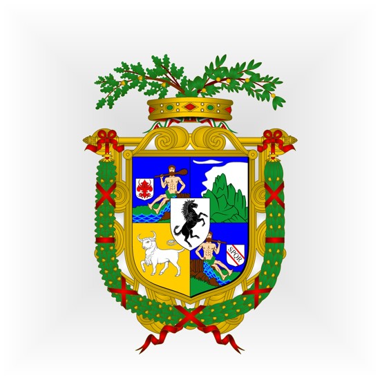 Blasonnement : Ecartelé : 1, d’azur, au sauvage assis à côté d’une source, le tout au naturel, accompagné à dextre d’un écusson d’argent, au lys épanoui de gueules ; 2, d’azur, au mont de sinople, le sommet dans un nuage d’argent ; 3, d’or, au bœuf d’argent (sic) ; 4, le premier quartier contourné, l’écusson d’argent, aux lettres « SPQR » de sable, entre deux cotices de gueules ;