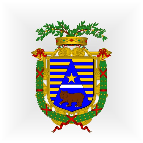 Blasonnement : D’azur, à la divise d’argent, accompagnée en chef d’une étoile d’or et en pointe d’un ours passant au naturel, chapé contre-burelé (14) d’azur et d’or.