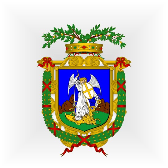 Blasonnement : Un Saint Michel terrassant le dragon sur un paysage, le tout au naturel.
