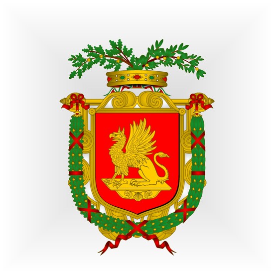 Blasonnement : De gueules, au griffon d’or, assis sur un piédestal du même.