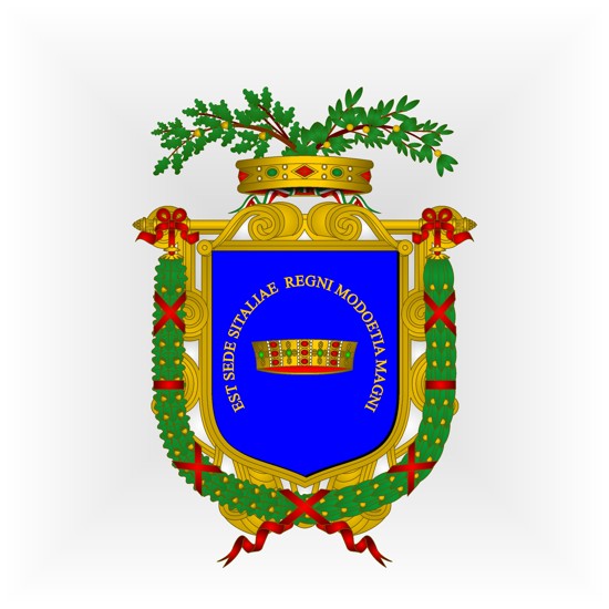 Blasonnement : D’azur, à la couronne de fer au naturel, entouré de la devise "EST SEDE SITALIAE REGNI MODOETIA MAGNI" d’or.