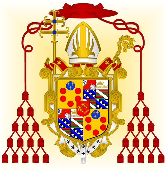Ecartelé : I et IV, d’or, à cinq tourteaux de gueules (2, 2 et 1), accompagnés en chef d’un tourteau d’azur, à trois fleurs de lys d’or (Médicis) ; II et III, parti de un coupé de deux : 1, de gueules, à la licorne d’argent, accornée d’or, naissante de la pointe et regardant un soleil d’or, chargé d’un disque d’argent à la guivre d’azur, engoulant de gueules, mouvant du franc-quartier ; 2, d’argent, au mot « humilitas » en lettres gotiques d’or, couronné du même, la couronne décalée à dextre ; 3 et 6, bandé de sable et d’argent nébulé et d’azur plain ; 4 et 5, fascé de gueules et de sinople, à la bande d’argent, brochante sur-le-tout (Borromée) ; sur-le-tout de l’écartelé : de gueules, au mors d’or, posé en bande.