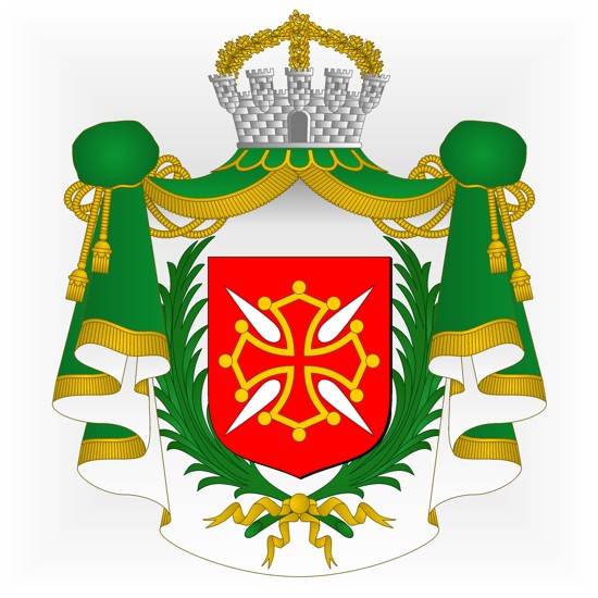 De gueules, à la croix de Toulouse d’or, cantonnée de quatre otelles d’argent en sautoir.