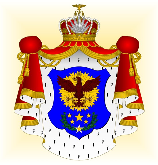 Voici le drapeau, les grandes armoiries, les moyennes armoiries et la cocarde militaire de ce Duché.